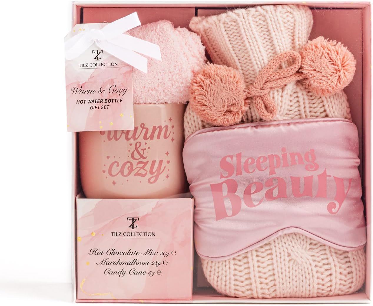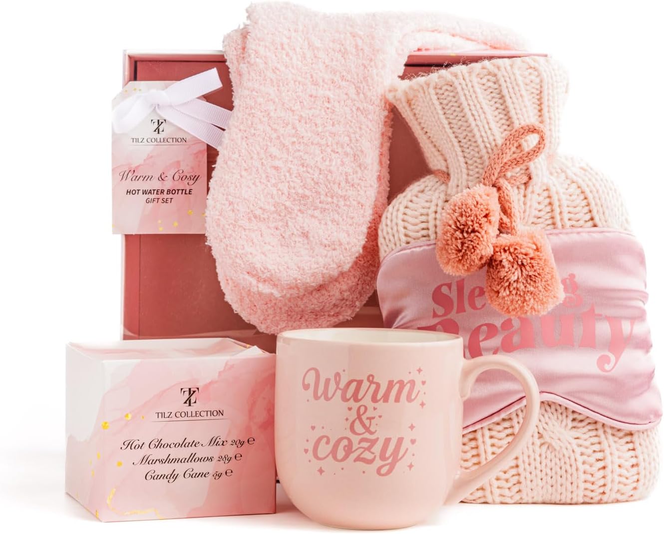 Mini Hot Water Bottle Warmth – The reusable hot water bottle with a cosy cover brings soothing heat on chilly nights and snug sofa sessions, ideal for “always cold” giftees and winter wind-downs. Pair it with the mug and socks for a complete cuddle-in-a-box experience; great as ladies Christmas gifts, stocking fillers and Secret Santa ideas.