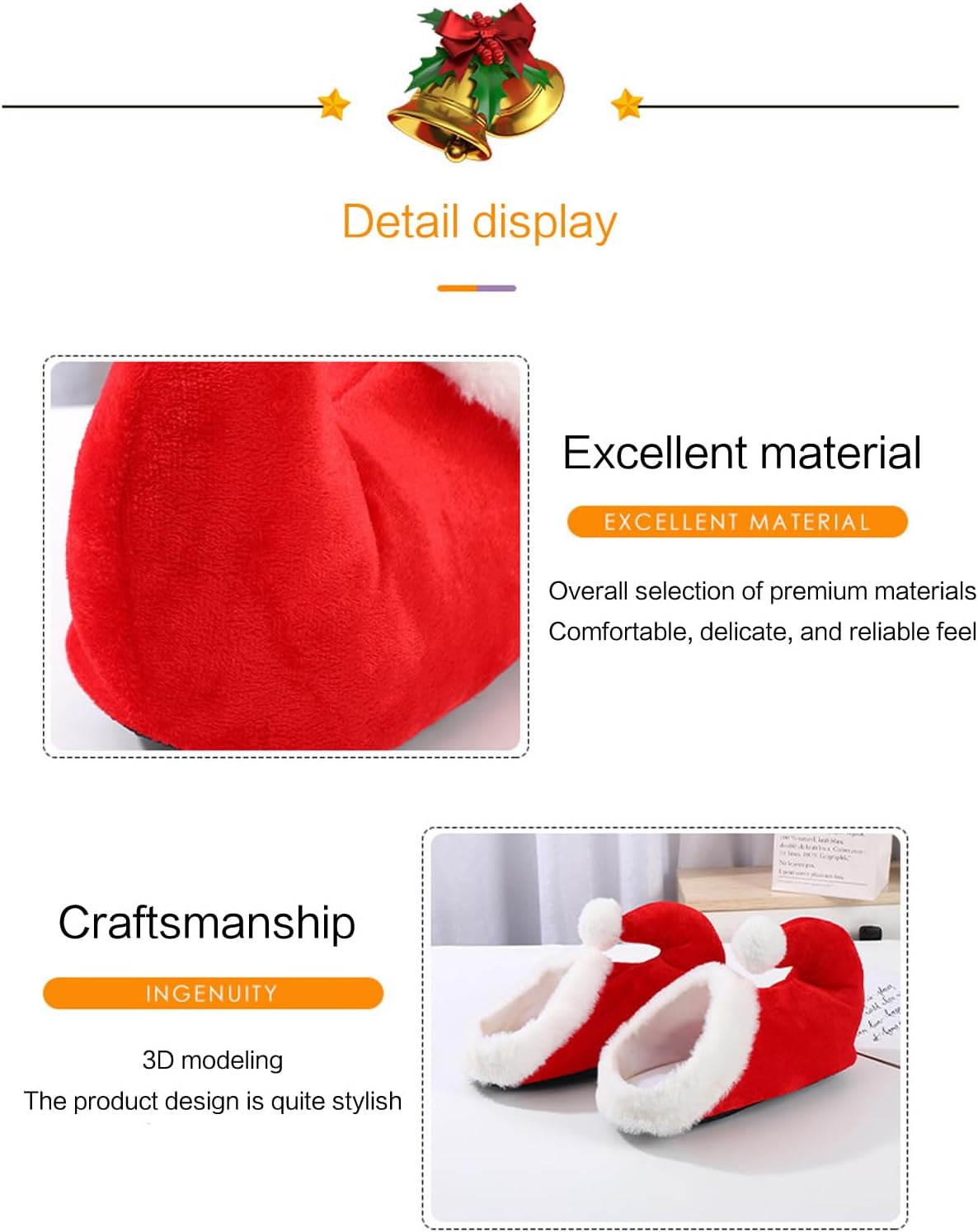 The holiday slippers are designed in bright red color, soft and comfortable, sure to catch the eye, create a strong atmosphere for the party, ideal party costume accessories.