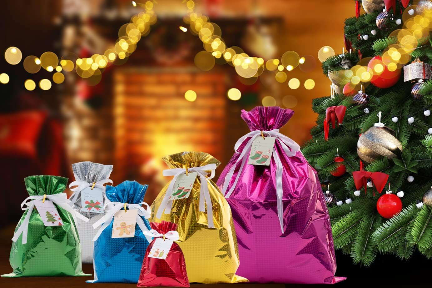 🟢 Each SMALUCK Xmas foil present bags comes complete with its own plug-in drawstring design and tags making it very practical, and it can be reused for several times. It will be an idea choice for busy people, young children or people with arthritic hands that difficult to wrap a present with traditional wrapping paper.