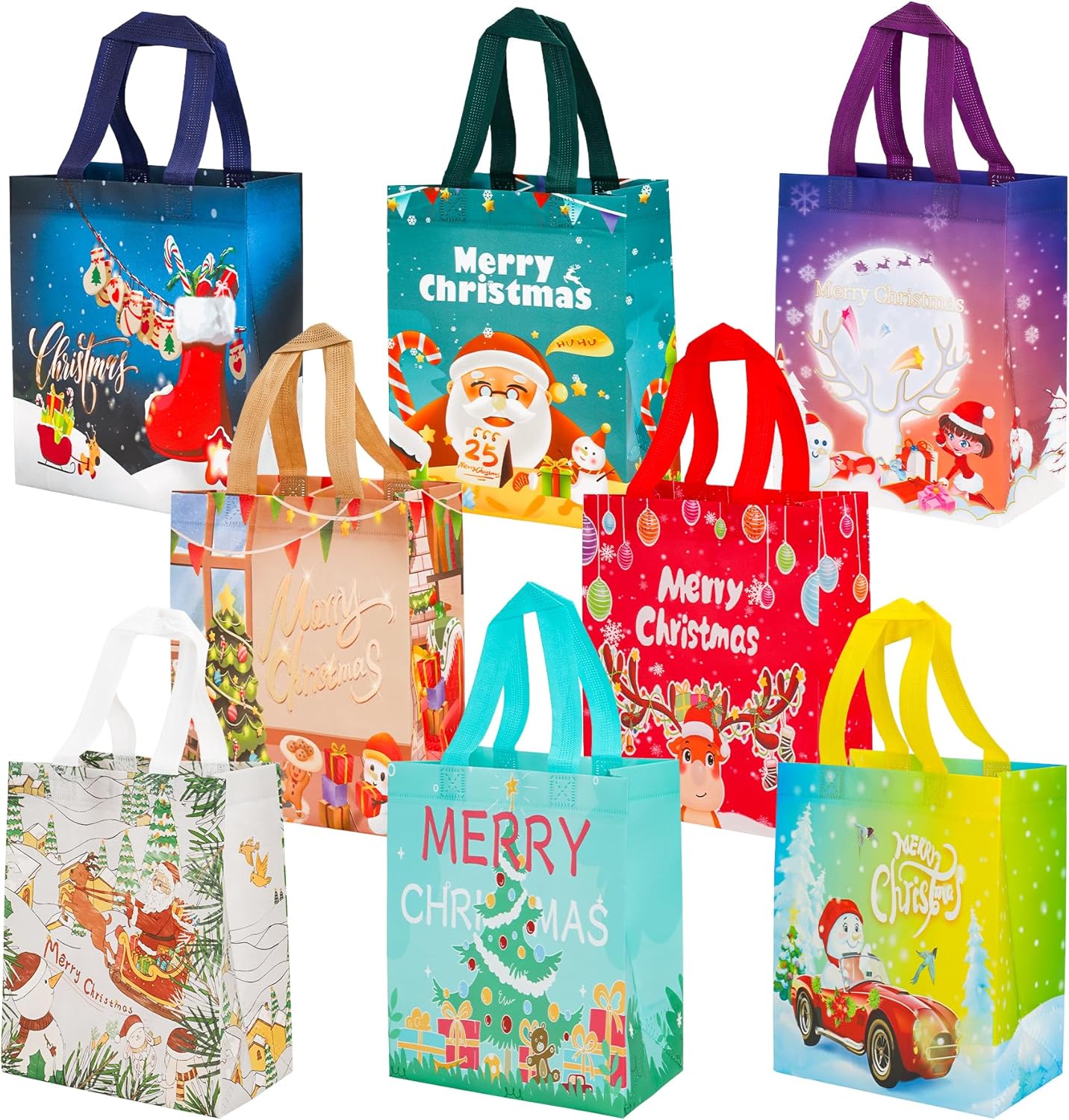 What you can Get: 8pcs 21 x 26 x 12 cm Christmas tote bags with handle in 8 different christmas style.