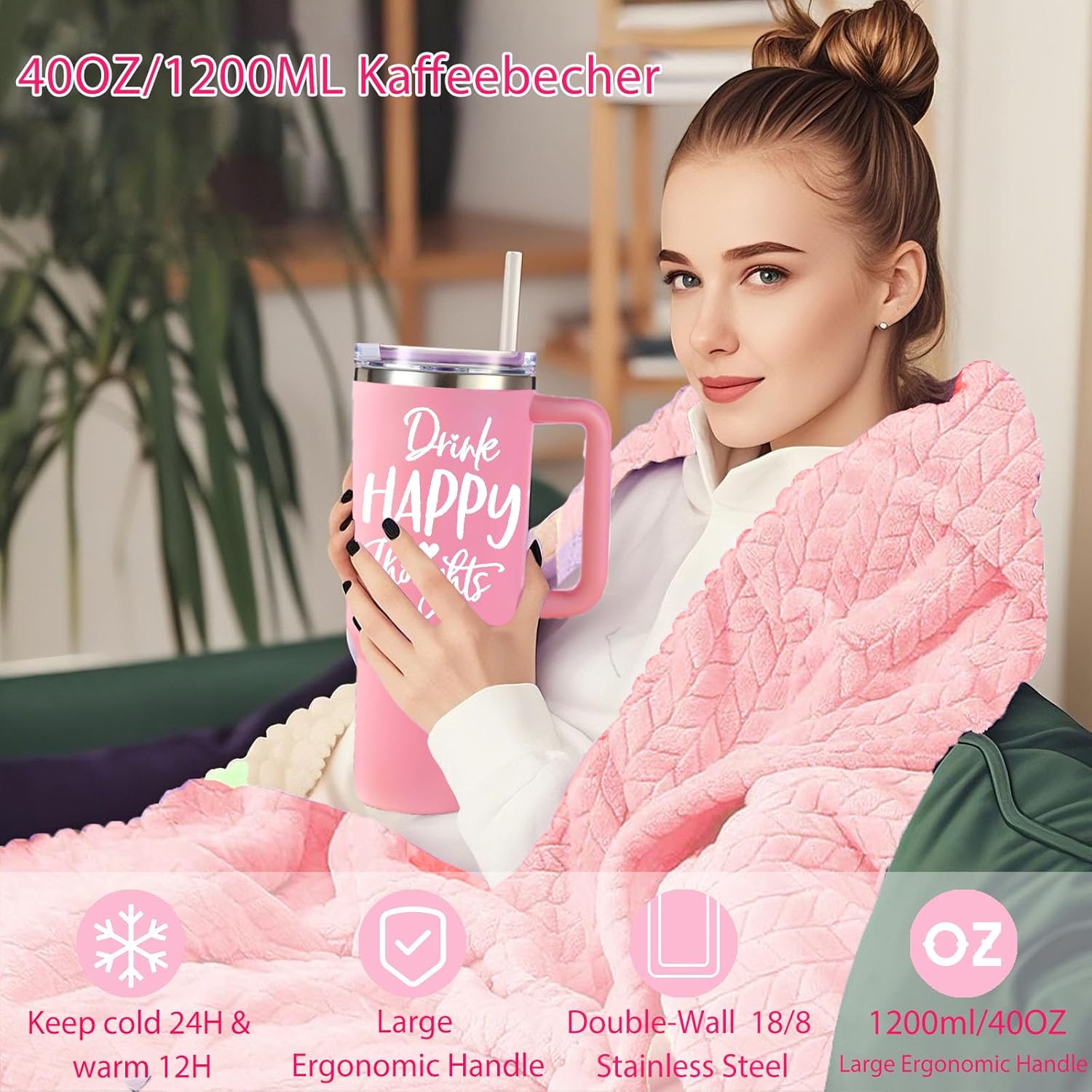 40 OZ Tumbler With Handle & Straw: The Drink Happy Thoughts insulated tumbler cup is crafted from premium 18/8 stainless steel, ensuring durability and resistance to drops and rust. It beverage temperature is up to 24 hours for cold and 12 hours for hot. The screw lid and airtight seal make sure 100% leak-proof, With a comfortable handle designed for easy grip and carry along. 40 OZ capacity is perfect for staying hydrated, drink all day long! Making it an ideal relaxation gifts