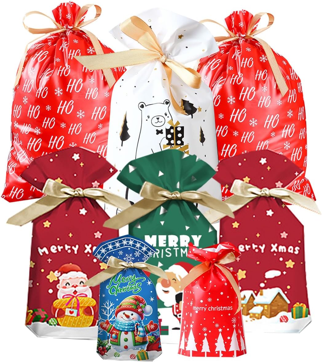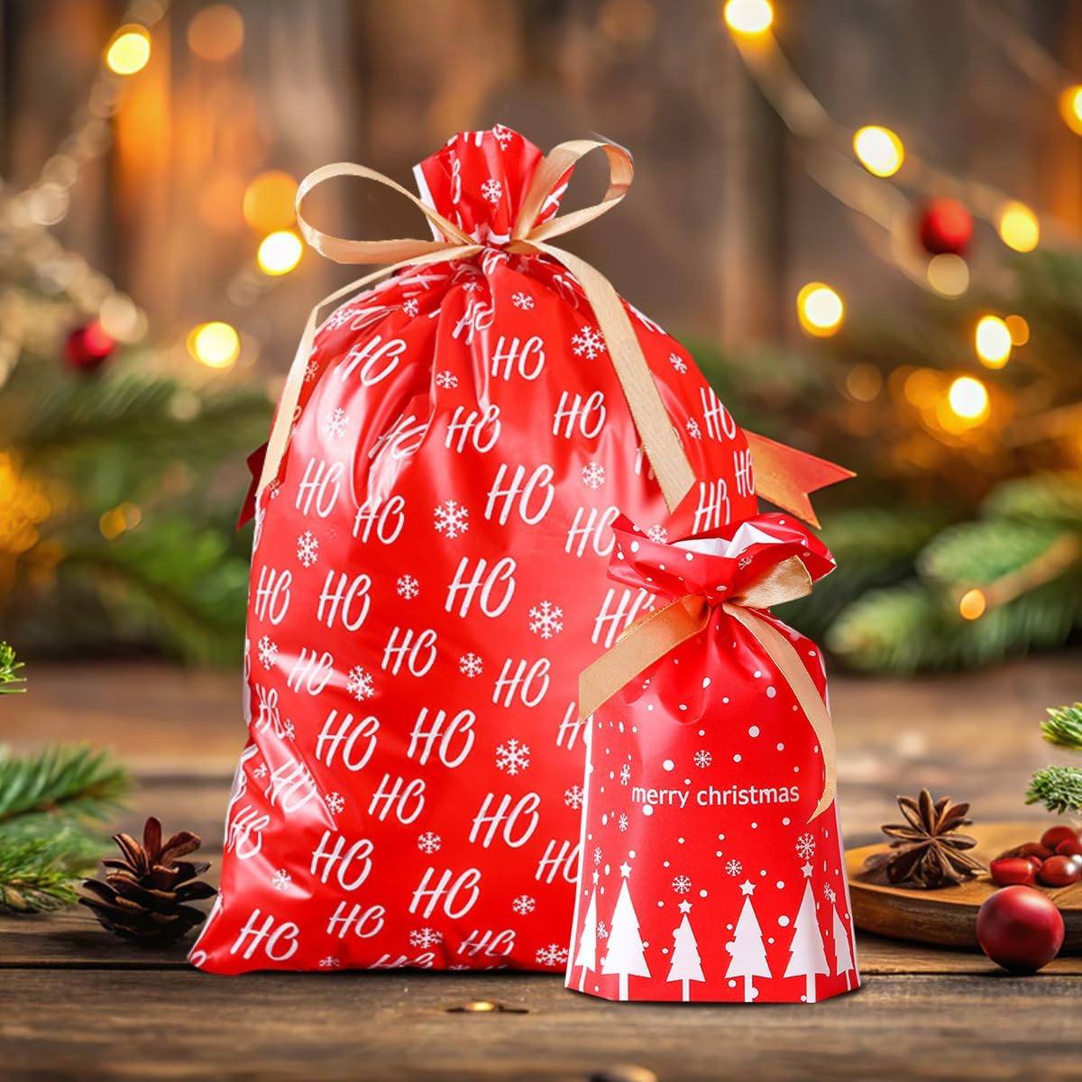 Christmas drawstring gift bags are assorted size, it’s suitable for large and small size gifts.