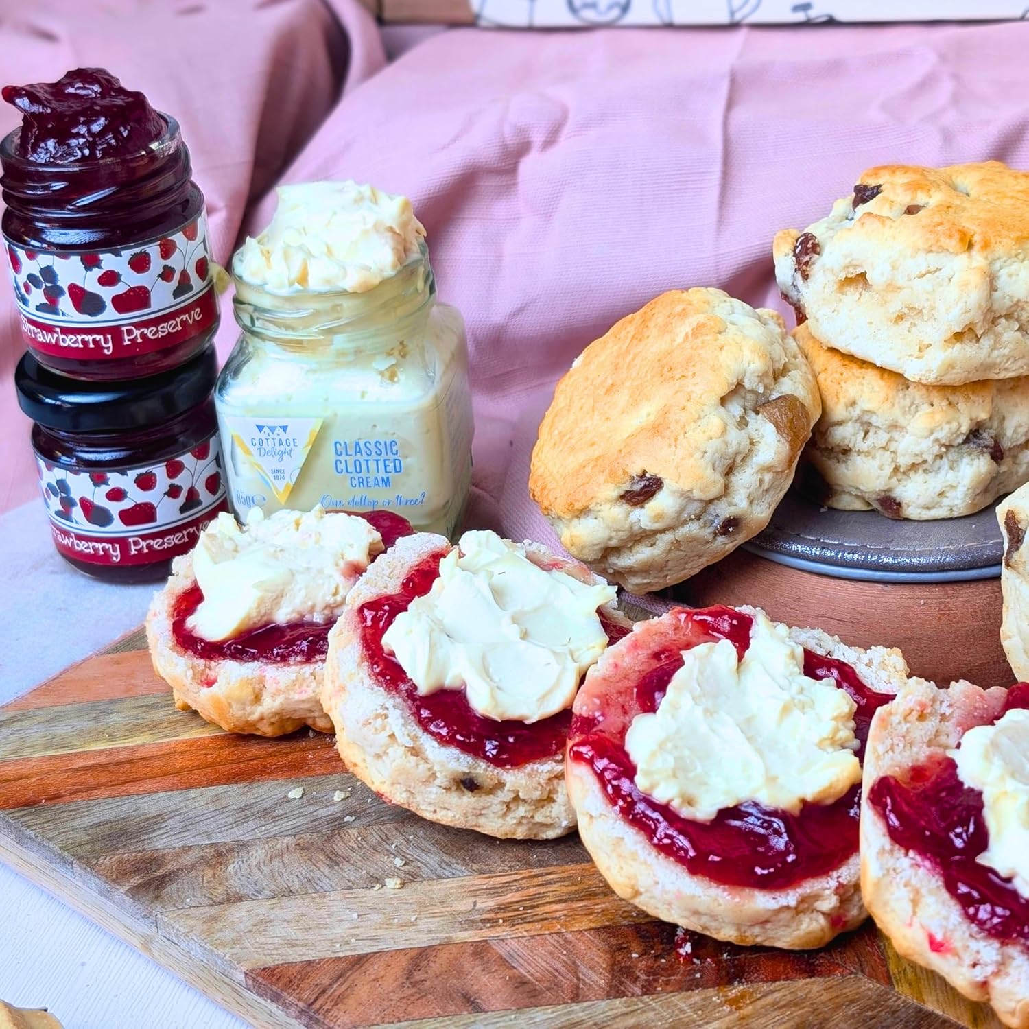 INDULGE IN FRESHLY BAKED GOODNESS: Becky’s Bakery Sultana Scones are lovingly made by family bakers using quality British flour. Paired perfectly with Classic Clotted Cream (85g) and two fruity Strawberry Preserves (42g each) for a luxurious cream tea moment.