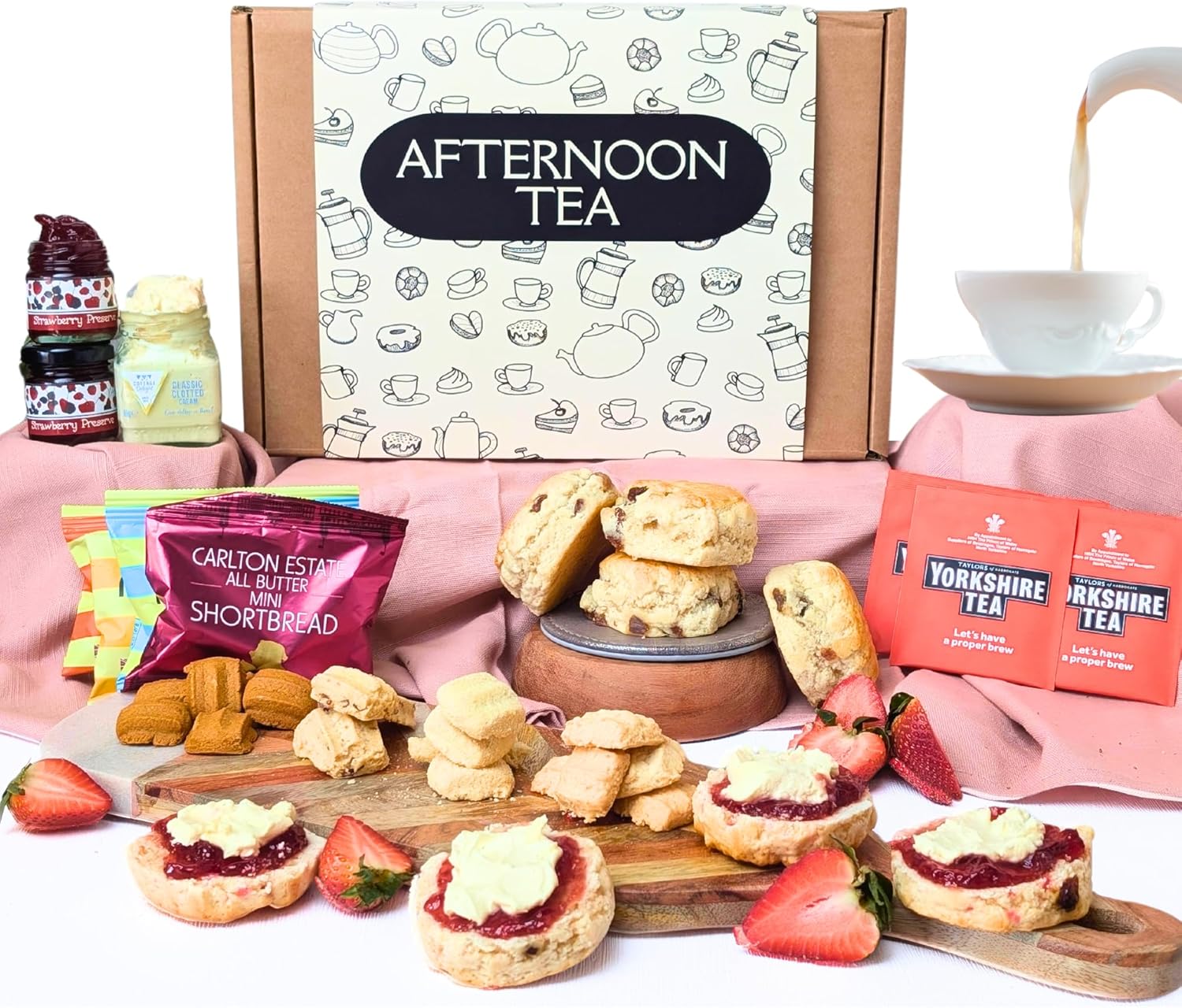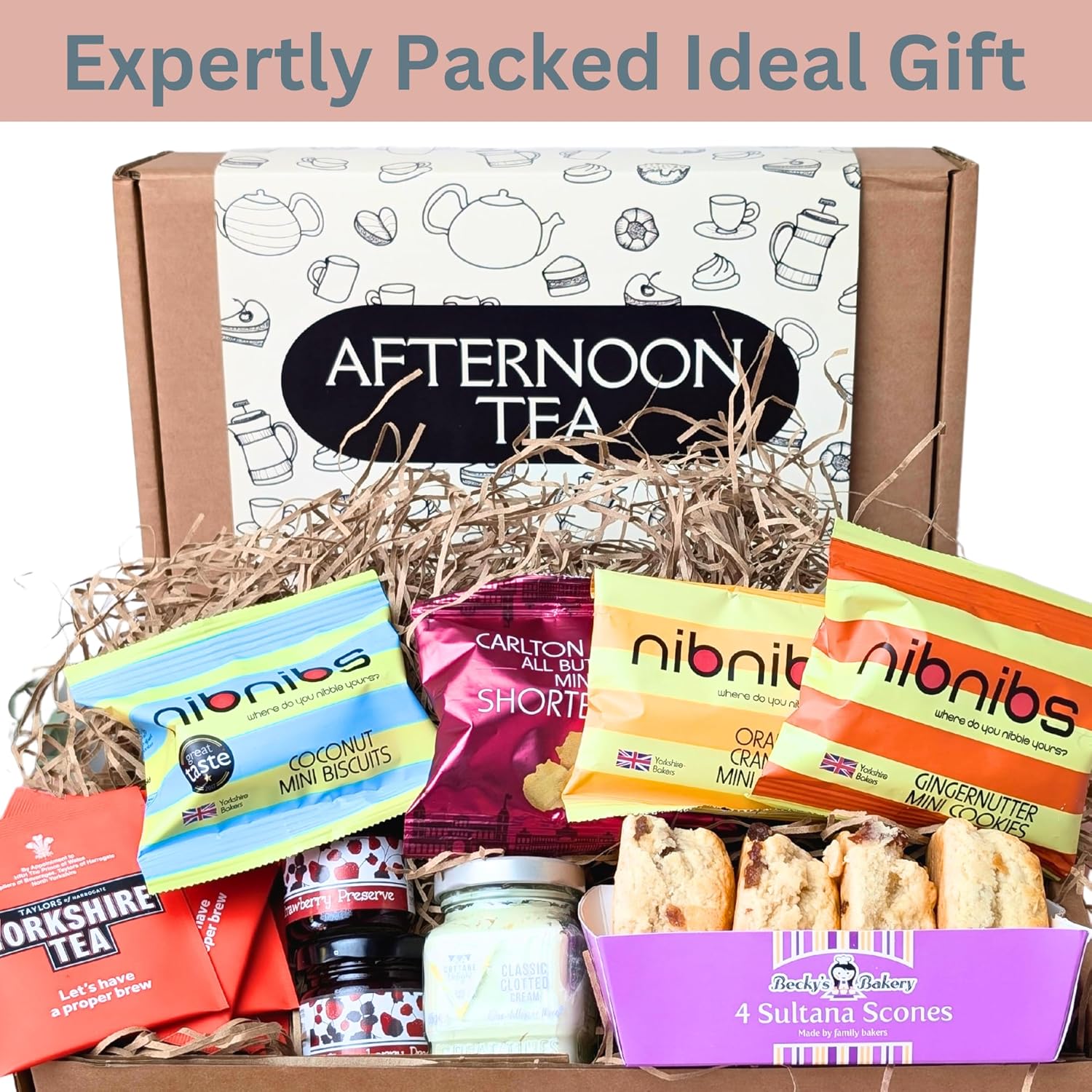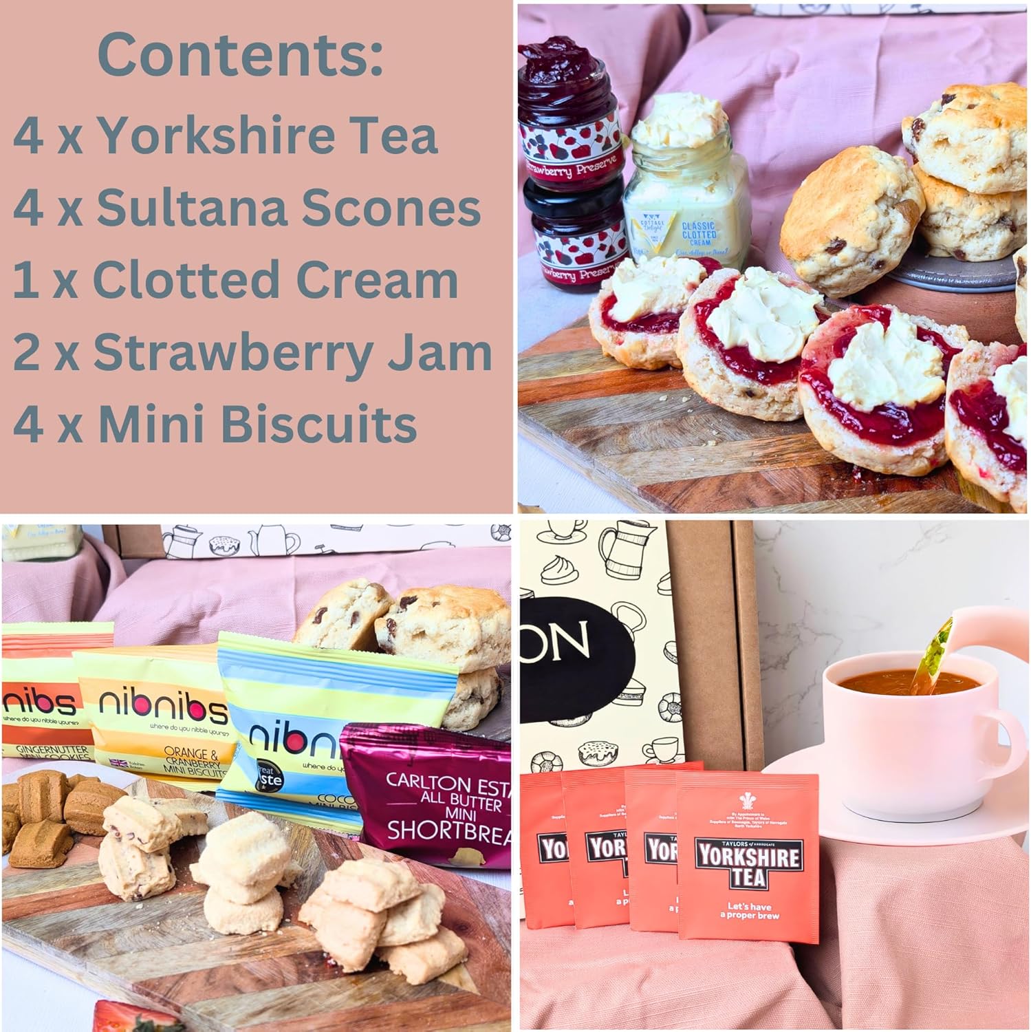 Bring the charm of a traditional UK afternoon tea to your home with this premium hamper. Includes 4 Yorkshire Tea bags, 4 classic sultana scones, rich clotted cream, fruity preserves, and a medley of buttery mini biscuits. - INDULGE IN FRESHLY BAKED GOODNESS