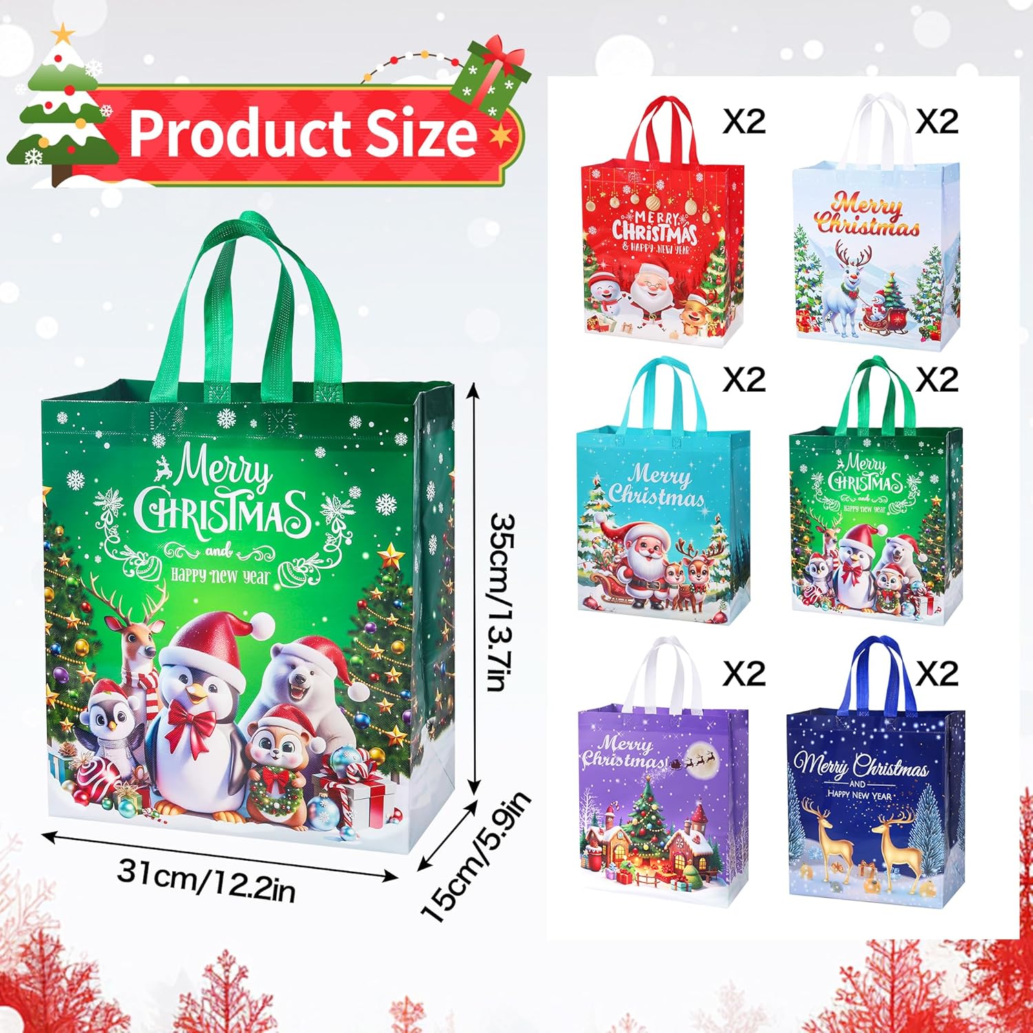 Premium Material:Our Christmas tote bags are made of high quality non-woven fabric with reinforced structure at the bottom, which will not break even after long time use, waterproof and reusable, and the bag can be folded for easy storage and space saving.