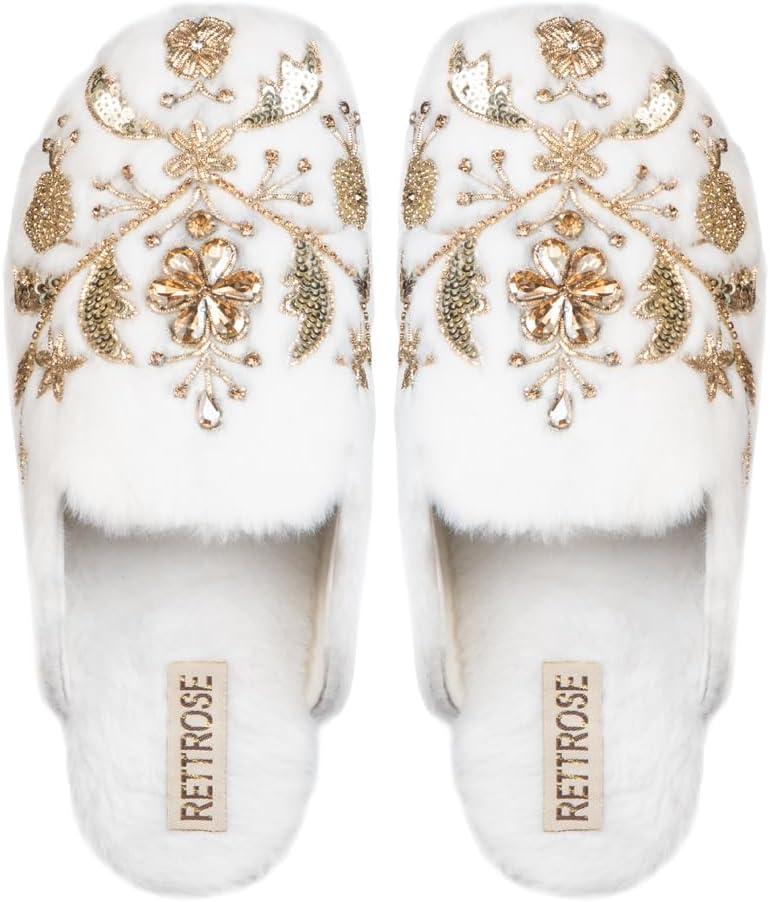 Indulge in everyday elegance with the RETTROSE Annie Cream Luxury Plush Diamanté Embellished Handmade Slipper. Expertly crafted with premium faux fur in a warm cream shade, these women’s slippers offer a sumptuous, front-covered design for ultimate comfort and style. The hand-embellished appliqué sparkles with white and cream diamanté, adding a glamorous touch to your lounging wardrobe. With a soft 1cm cushioned sole, these slippers are perfect for all-day indoor wear, keeping your feet cosy while exuding effortless sophistication. Each pair is handmade, ensuring a unique, luxury finish.