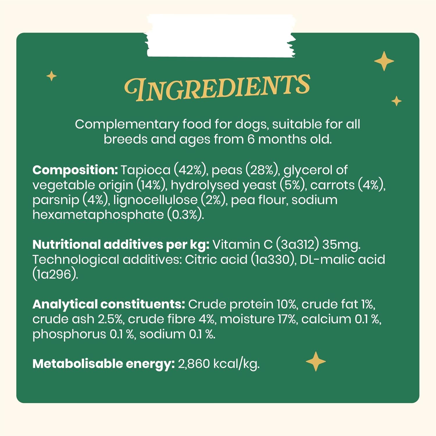 When ordinary just won’t do. No Christmas Dinner’s complete without a side serving of vibrant, nutritious veggies. And the classic combinations are always a hit… Which is why we’ve encapsulated earthy Carrots and sweet Parsnips into a seasonal, vegan, grain-free dental stick. One for the pooches to obsess over. Carrots support healthy eyes and vision, and are loaded with antioxidants, while Parsnips contibute to heart and muscle health. The SHMP in these Christmas chews helps reduce tartar and plaque build-up, by binding to the minerals in saliva and slowing down the deposit on teeth – giving your dog an extra reason to smile this Christmas. Go on, treat your furry family member to a festive feast, made just for them.