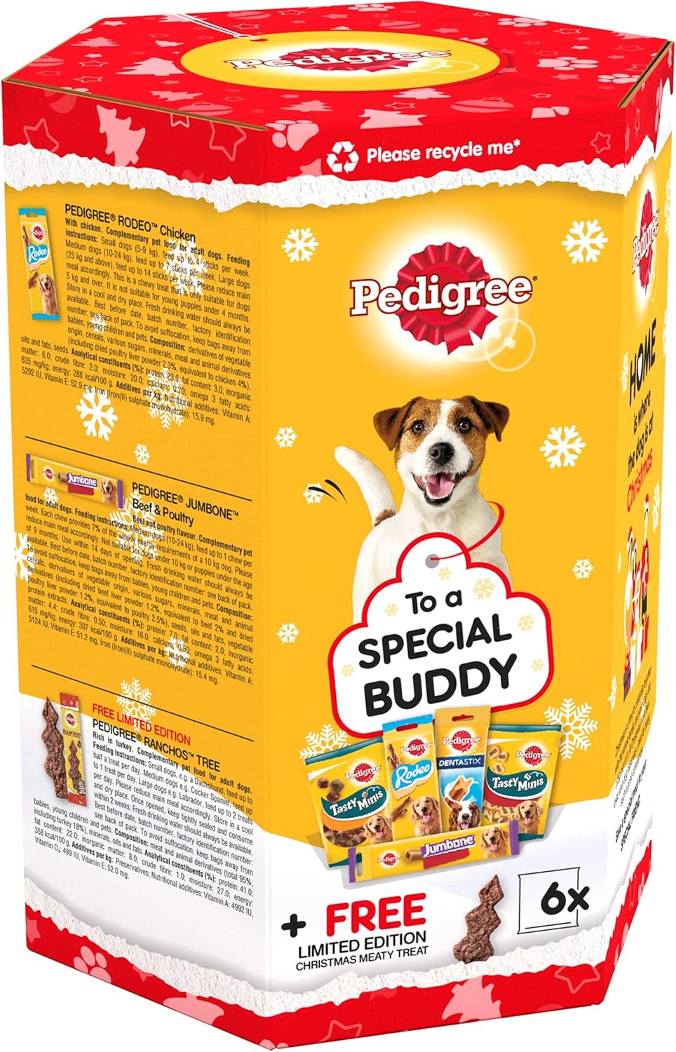 Pedigree Care & Treats Christmas Gift Box is a perfect holiday gift for dogs! Share the love and spoil your furry friend for being such a good companion, with a mix of 5 Pedigree favorites delicious dog treats, chews and Pedigree Dentastix to support and fuel canines exuberant love of life. Delicious, low-fat dog treats – Pedigree Jumbone dog chews cleverly combine a tough chewy outer with a succulent, tasty centre. Tasty, chewy twists – Pedigree Rodeo dog chews have a deliciously chewy texture that is full of succulent flavour. Succulent bitesize dog treats – Pedigree Tasty Minis are delicious treats in a range of tasty flavours & textures. Ideal for training, rewarding or just treating your dog. Pedigree dog treats for Christmas includes: 1x Pedigree Dentastix (3 chews) + 1x Pedigree Jumbone + 1x Pedigree Rodeo (4 pieces) + 1x Pedigree Tasty Minis Chunks + 1x Pedigree Tasty Minis Slices