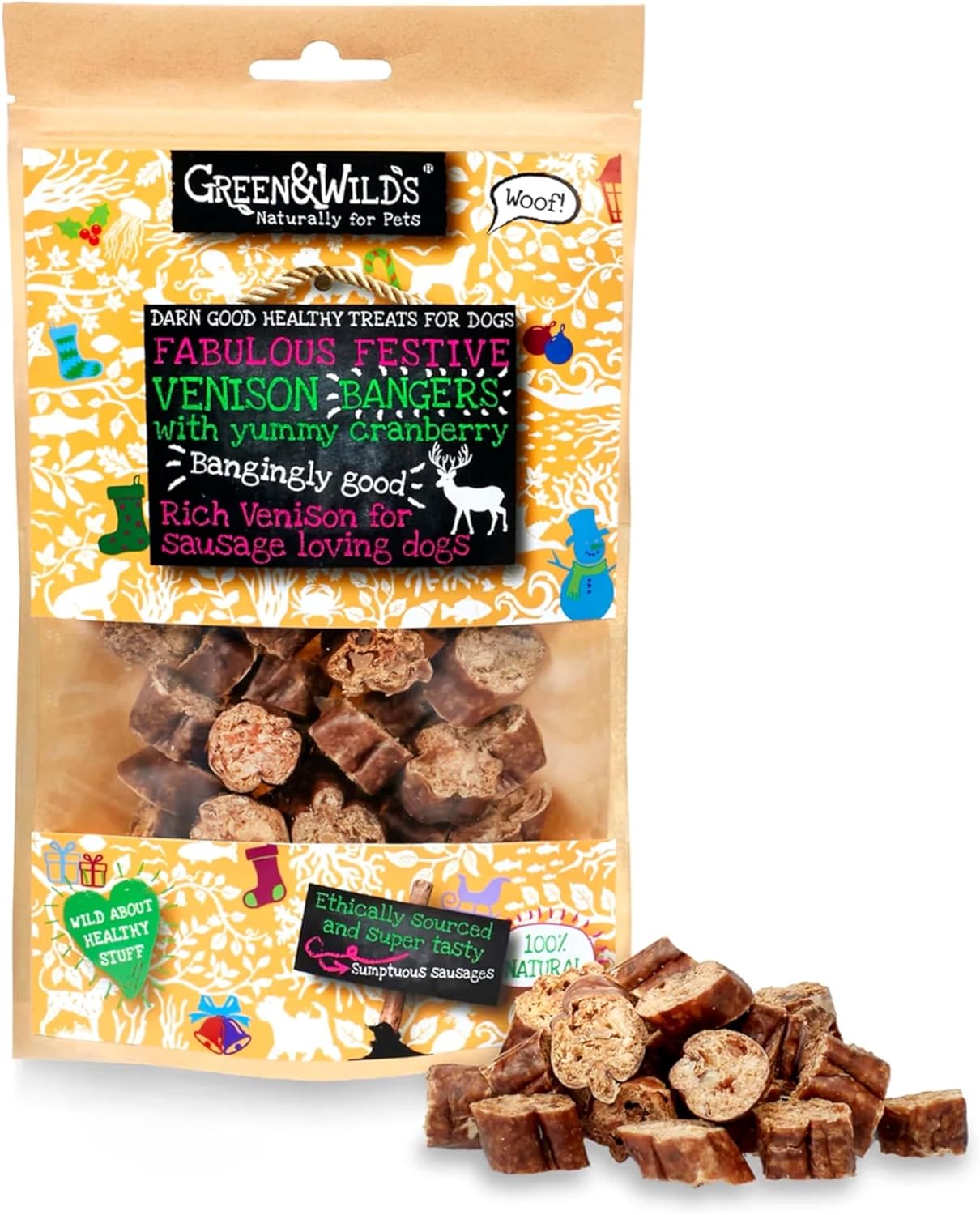 Green & Wilds Eco-Friendly Festive Dog Treats – Venison Bangers with Cranberry