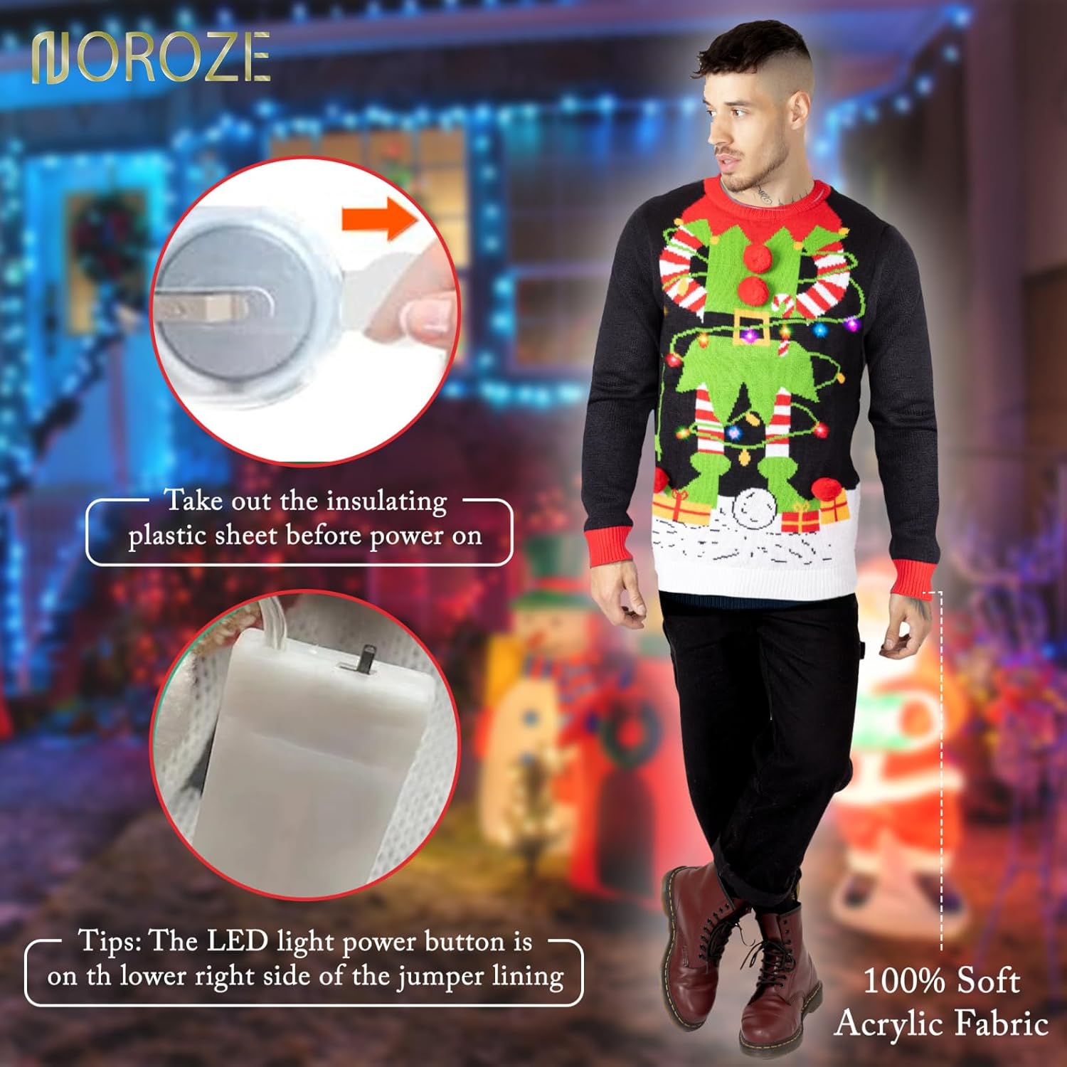 Get ready to light up your holiday season with the NOROZE Unisex Men’s LED Christmas Jumper! This festive pullover stands out with its vibrant design featuring playful motifs such as LED-lit trees cheerful elves, and Santa Claus himself. The enchanting LED lights add a magical touch making it the perfect centerpiece for any holiday gathering. Whether you’re attending an ugly sweater party or simply want to spread Christmas cheer this jumper captures the spirit of the season in a fun and eye-catching way. Crafted from 100% soft acrylic the NOROZE Christmas jumper ensures both warmth and style without compromising comfort. The breathable fabric allows for easy wear during holiday festivities so you can celebrate without feeling overheated. The long sleeves are complemented by ribbed hems and cuffs, providing a snug fit that keeps the chill at bay while letting you look effortlessly festive. Versatile and unisex this jumper is an excellent choice for any holiday occasion be it family gatherings work parties or decorating the Christmas tree. Available in UK sizes S-XXL, it’s designed to fit everyone comfortably. Treat yourself or surprise your loved ones with this delightful LED Christmas jumper and make your holiday celebrations even more enjoyable!