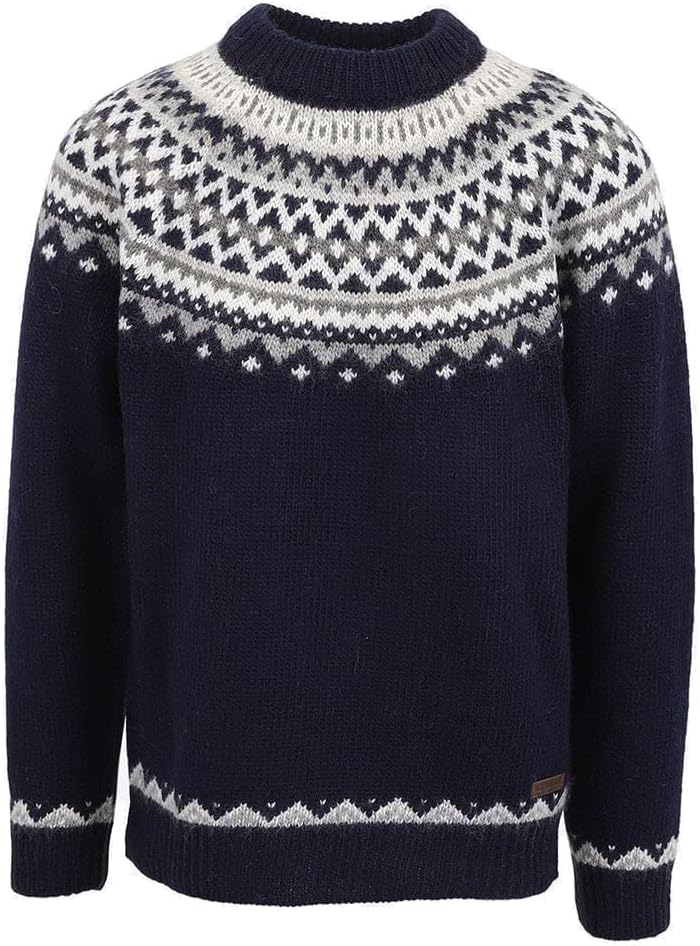 This knitted jumper with Icelandic knitting pattern is made out of wool and fits both him and her. The wool jumper features a hand-knitted classic Lopapeysa design. And while these Icelandic jumper patterns are familiar, the added features of this jumper make it an exceptional find. This jumper allows for real versatility, wear it indoors or out as an outer layer or under a shell. Wool jumpers are naturally breathable, too, helping to regulate body temperature. Enjoy the Skjaldbreiður jumper for everyday wear, no matter where the day takes you. Made out of 100% wool and available in several colour combinations.